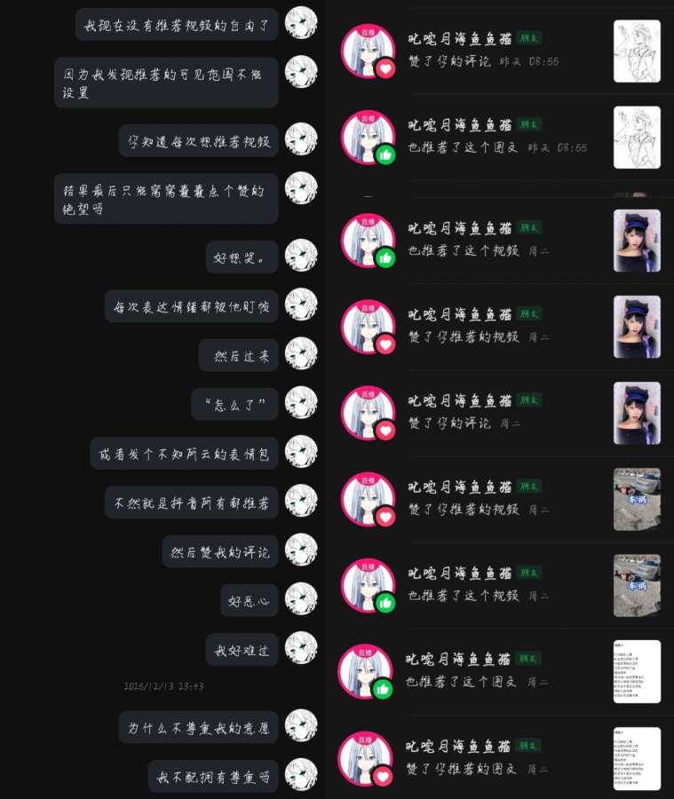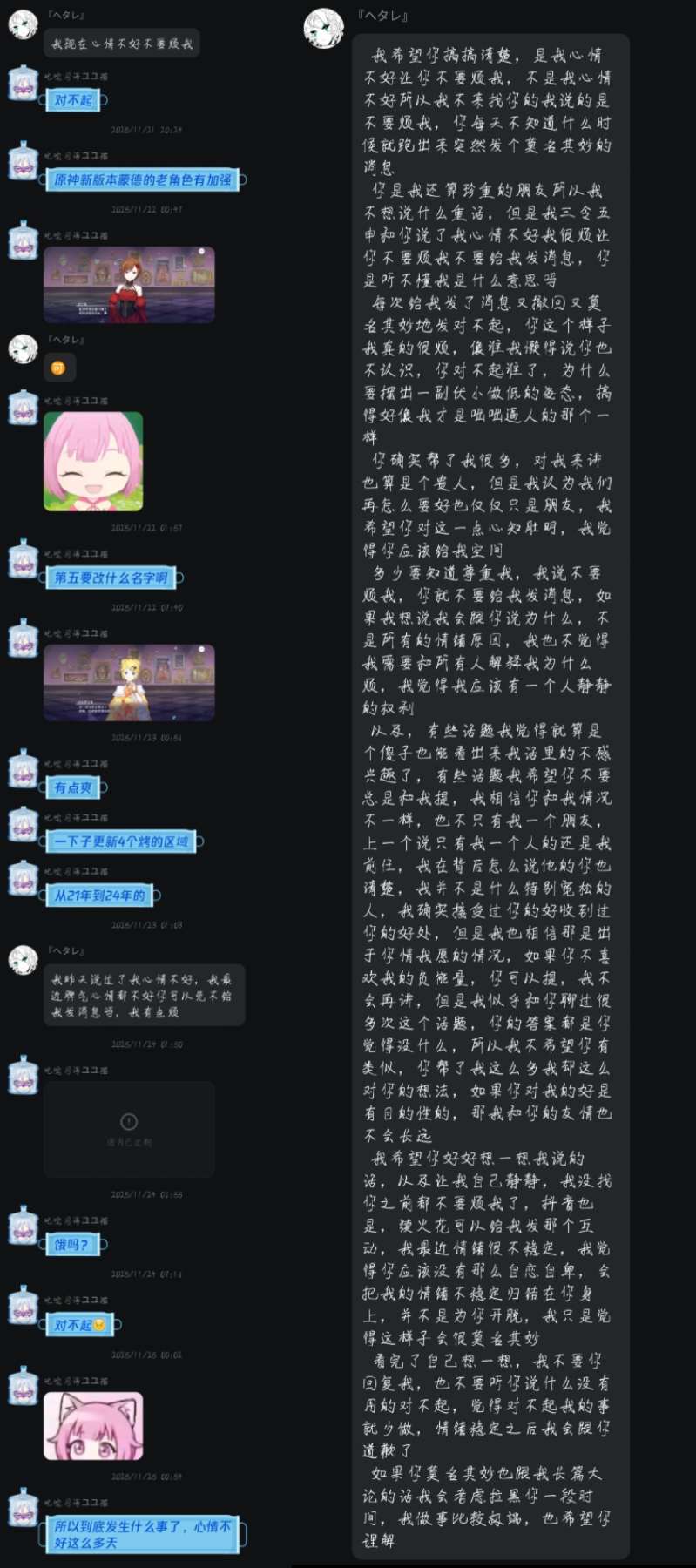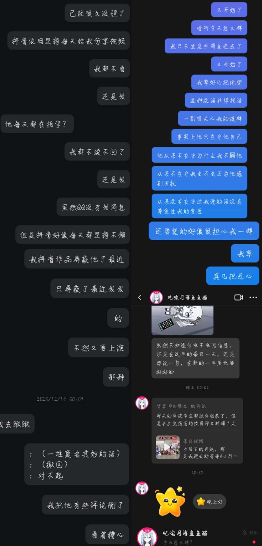 烦死了别烦我了行不行,诶我跟你只是网友,不要一副我是负心汉的样子行不行,我到底和你有啥关系,我没有义务每天都要回你那些莫名其妙的话,也没有义务看着你莫名其妙发一些话又莫名其妙撤回又莫名其妙说一句对不起,搞搞清楚有抑郁症有焦虑症的是我行不行,你现在是几个意思,想用对不起让我觉得愧疚,然后反过去是没事然后安慰你吗,你搞搞清楚行不行,我跟你八竿子打不着的关系,我最多就是在上网的时候加了个人,没了,你到底把自己当成啥了,每次聊着聊着莫名其妙蹦出来一句我喜欢你或者我爱你已经很诡异很阴间了,能不能别让我承受你莫名其妙的情绪别让我给你提供情绪价值了行不行